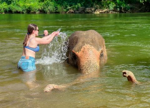 After lunch, watch them enjoy playing in a mud pit. With no riding, walk with the elephants to the river and bathe the elephants.
